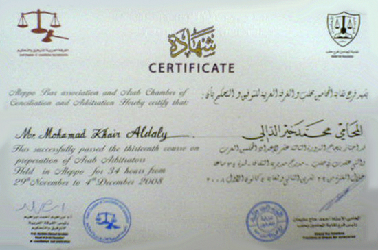 Mohammed Khair AlDali is a lawyer since 19/8/1992, Damascus Bar association, Syrian Arabic Republic